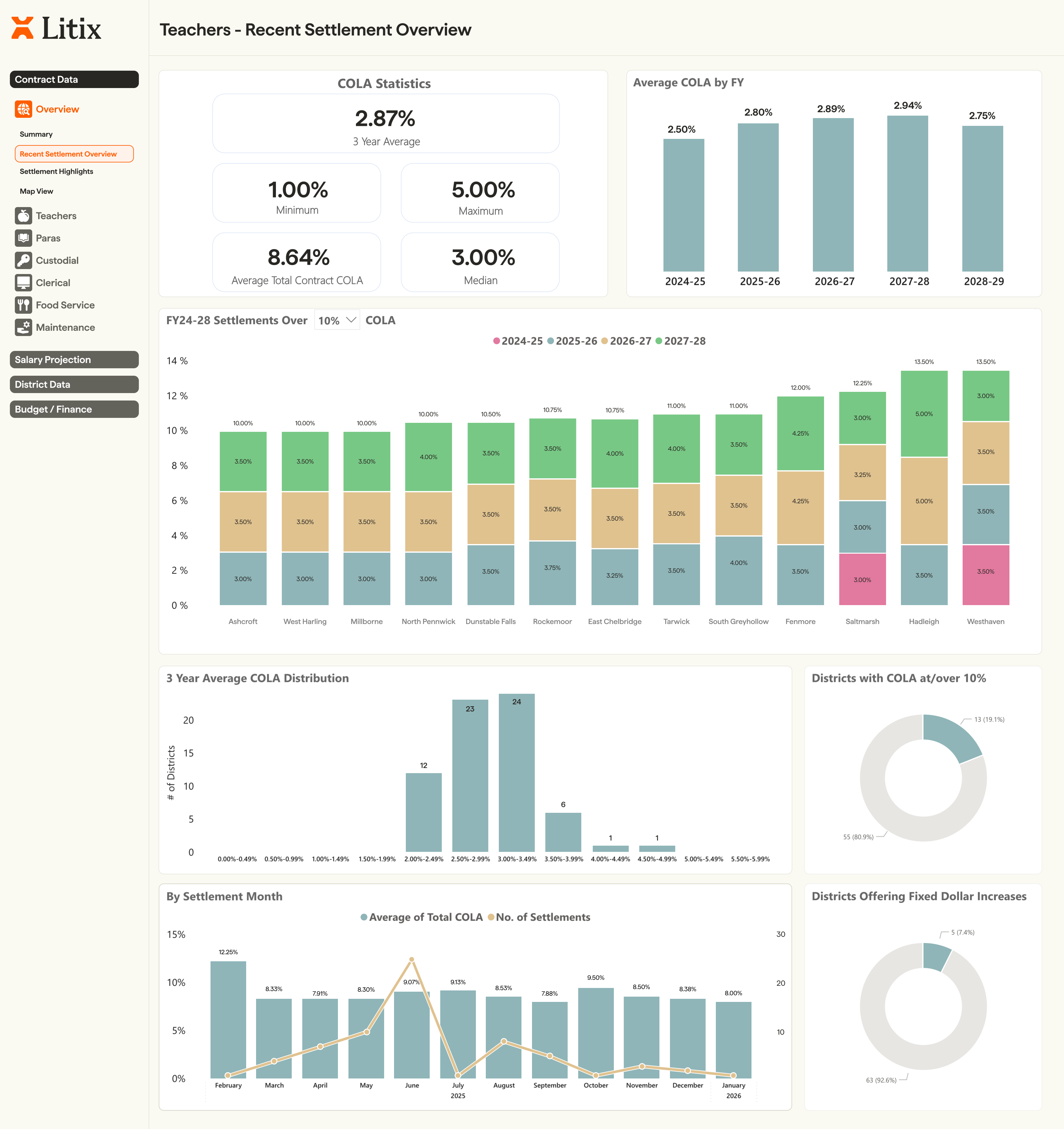 Collective bargaining intelligence. Thousands of verified data points—salary benchmarks, settlement trends, and budget projections—updated in real time and organized for the way you prepare. Model scenarios, compare against genuine peers, and bring confidence to every conversation.